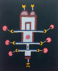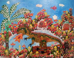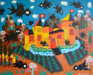 Avec un grand talent de coloriste et un sens graphique inné, c’est un peintre naïf qui nous entraîne dans des lieux imaginaires, avec en arrière plan ce léger doute sur la réalité. Les choses sont ainsi faites, mais ne pourraient-elles pas être aussi comme cela ? Cette distanciation nous emporte et nous fait renouer avec des émotions que nous avions ressenties enfants, des sensations fortes et puissantes vécues lors de nos premières années, lorsque nous découvrions pas à pas le monde extérieur, la vraie vie.